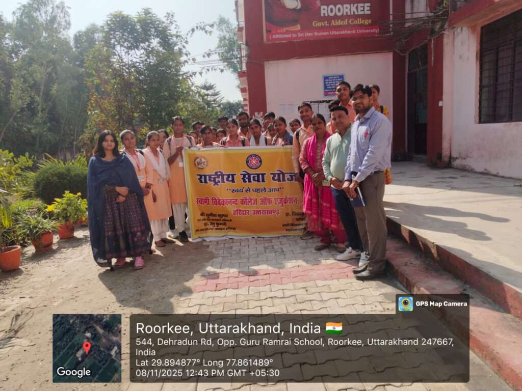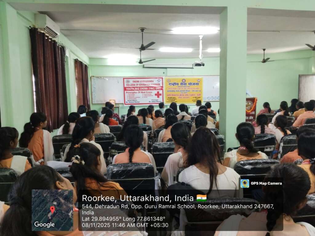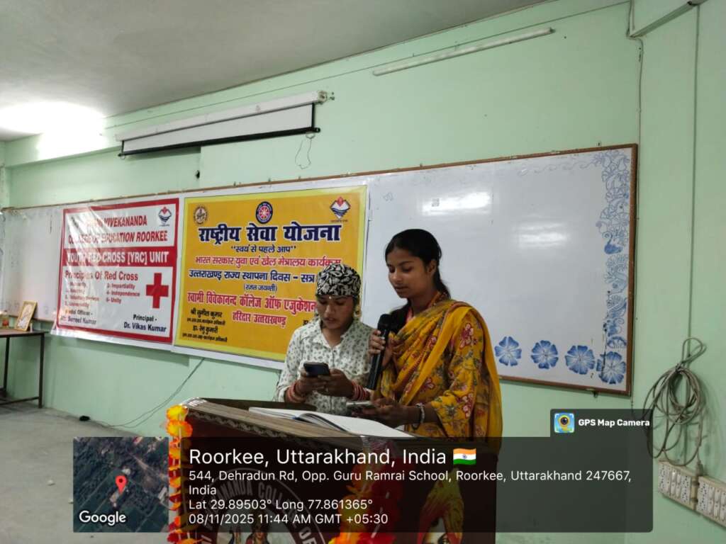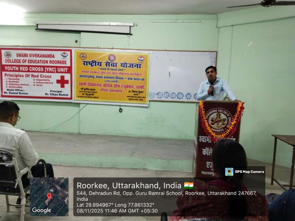 रूड़की:- स्वामी विवेकानंद कॉलेज ऑफ एजुकेशन, रूड़की में आज एन.एस.एस. इकाई एवं रेड क्रॉस यूनिट के तत्वावधान में उत्तराखंड स्थापना दिवस की रजत जयंती के उपलक्ष्य में एक दिवसीय शिविर का भव्य आयोजन किया गया। यह कार्यक्रम महाविद्यालय के प्राचार्य डॉ. विकास कुमार की अध्यक्षता में सम्पन्न हुआ।