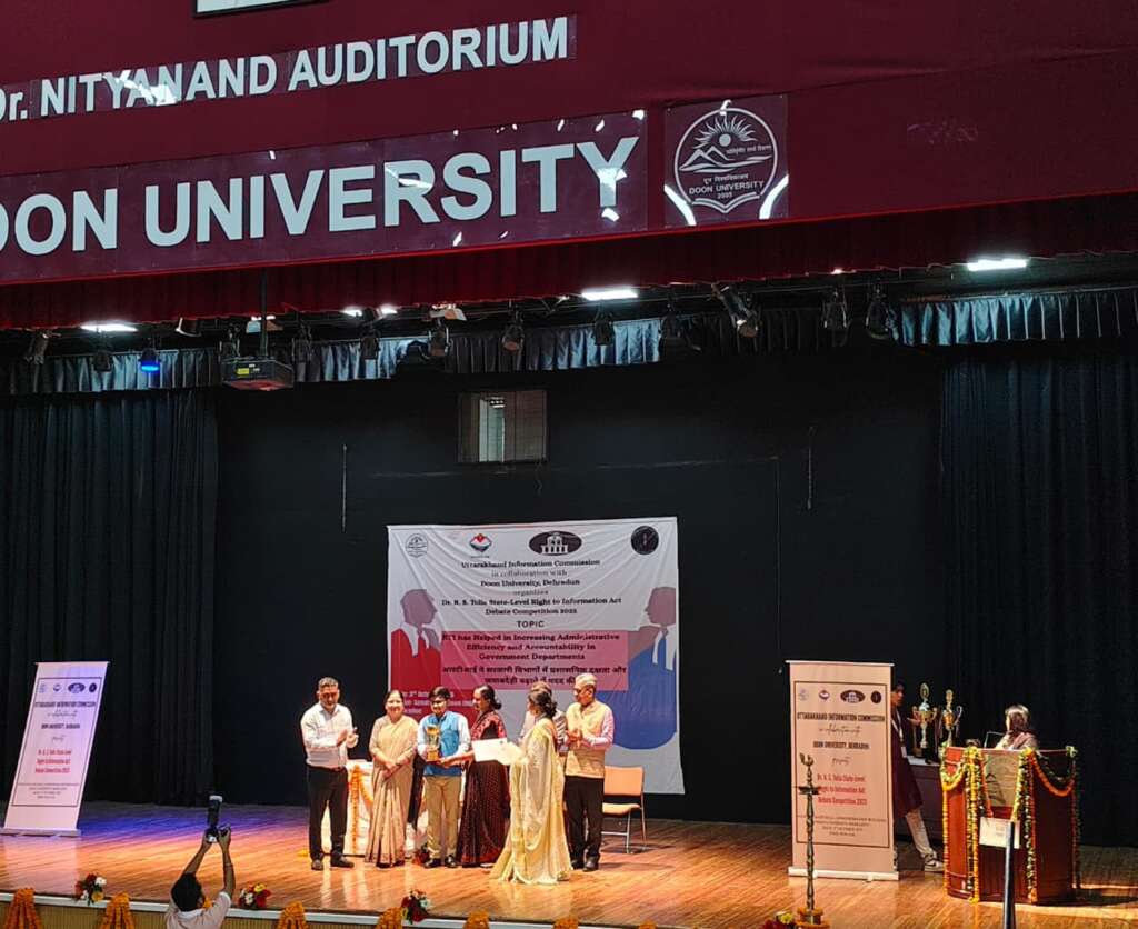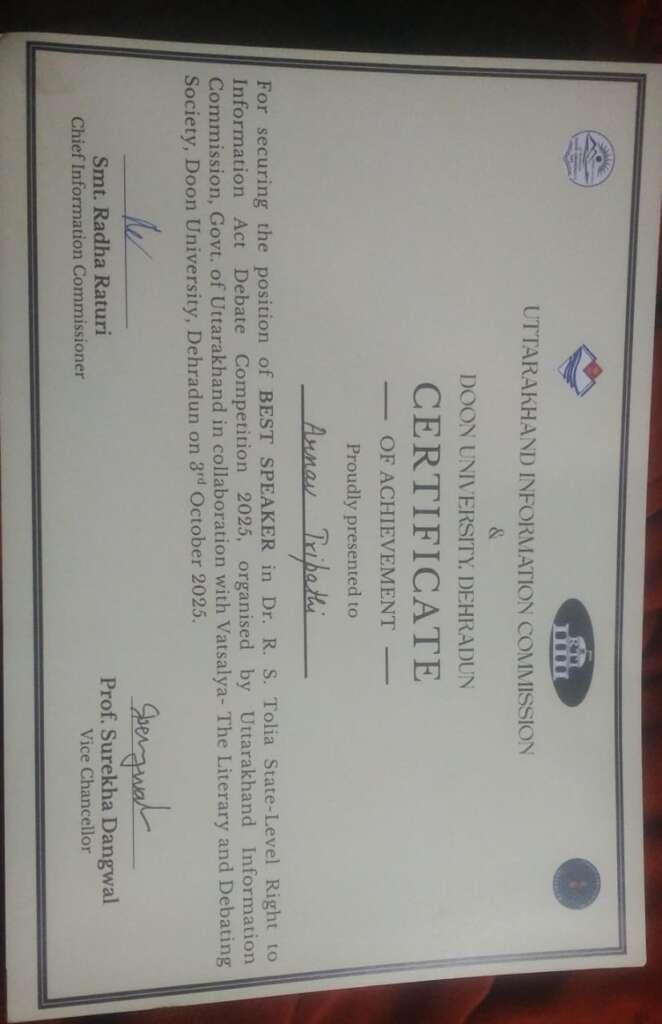 यह प्रतियोगिता सूचना का अधिकार (आरटीआई) सप्ताह के अवसर पर दून विश्वविद्यालय, देहरादून में आयोजित की गई थी, जिसमें राज्य के विभिन्न विश्वविद्यालयों एवं महाविद्यालयों के प्रतिभागियों ने हिस्सा लिया। अर्णव त्रिपाठी ने अपने तार्किक दृष्टिकोण, सटीक अभिव्यक्ति एवं आत्मविश्वासपूर्ण प्रस्तुति से निर्णायक मंडल को प्रभावित किया और सर्वश्रेष्ठ वक्ता घोषित किए गए।
