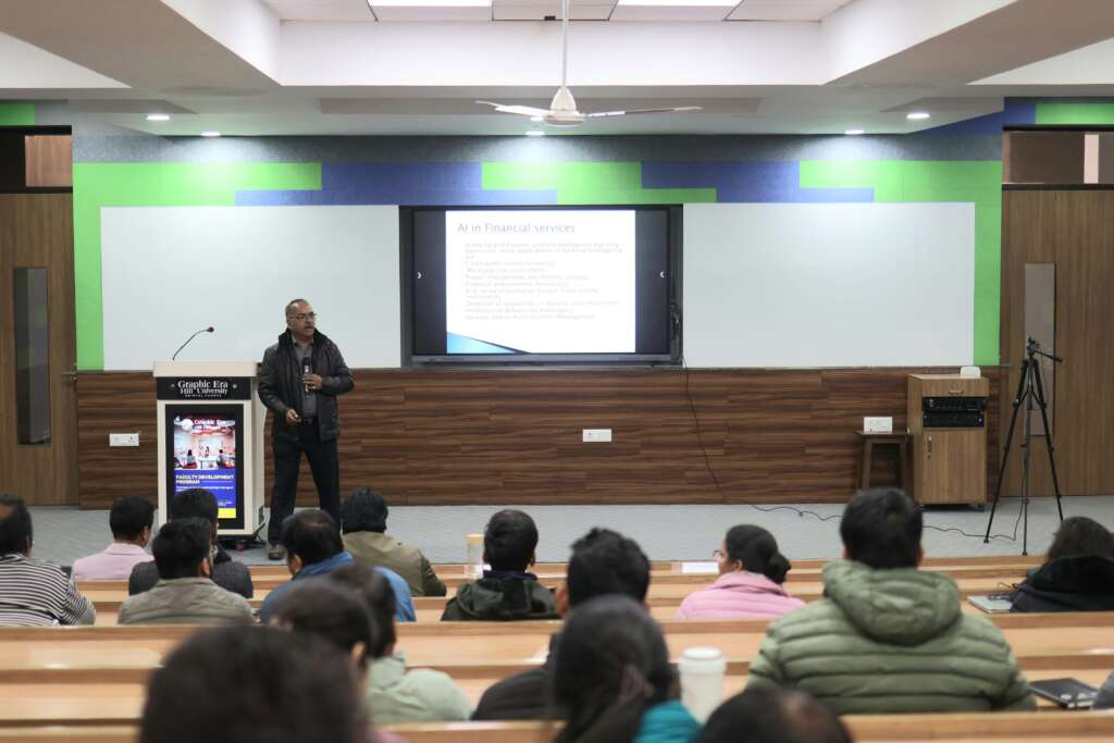 इस अवसर पर मुख्य अतिथि के रूप में कुमाऊँ विश्वविद्यालय, नैनीताल के कंप्यूटर साइंस विभाग के एसोसिएट प्रोफेसर डॉ. सुनील कुमार अरोड़ा का स्वागत एवं सम्मान किया गया। कार्यक्रम को संबोधित करते हुए ग्राफिक एरा हिल विश्वविद्यालय, भीमताल परिसर के निदेशक ने कहा कि Artificial Intelligence को कोई चुनौती के रूप में देख रहा है तो कोई इसे अवसर के रूप में, ठीक उसी प्रकार जैसे कभी इंटरनेट के आगमन पर प्रतिक्रियाएँ देखने को मिली थीं। उन्होंने कहा कि तकनीकी विकास के बावजूद शिक्षकों की भूमिका सदैव महत्वपूर्ण बनी रहेगी। Artificial Intelligence शिक्षण प्रक्रिया को सहयोग दे सकता है, लेकिन शिक्षक का मार्गदर्शन और मेंटरशिप कभी प्रतिस्थापित नहीं की जा सकती।