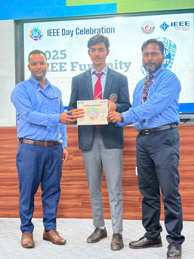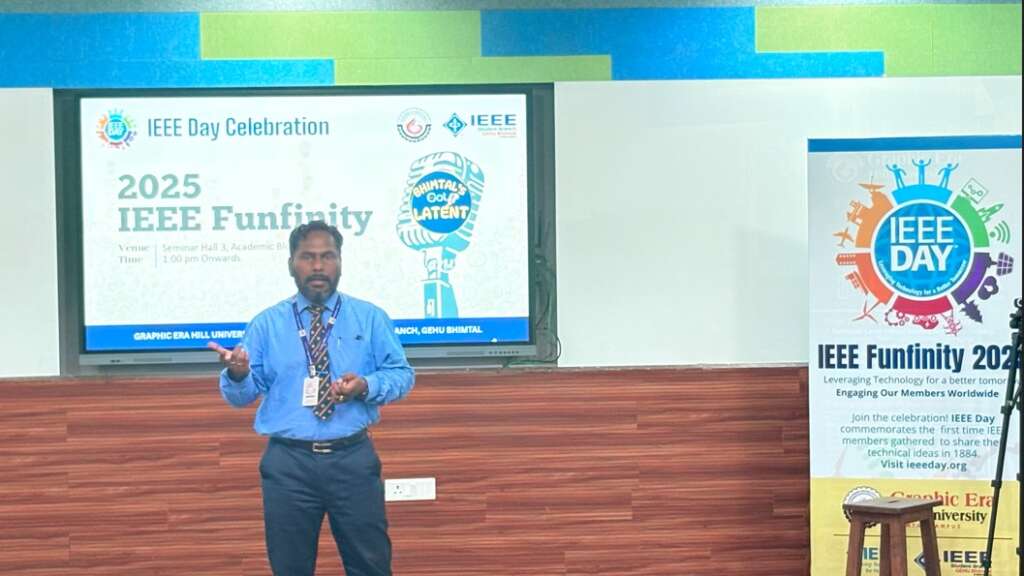 भीमताल/नैनीताल:- ग्राफिक एरा हिल यूनिवर्सिटी, भीमताल परिसर में IEEE दिवस 3-दिवसीय नासा इंटरनेशनल स्पेस ऐप्स चैलेंज के माध्यम से बड़े उत्साह के साथ मनाया गया, जिसमें वास्तविक दुनिया एवं अंतरिक्ष विज्ञान की समस्याओं के समाधान हेतु युवा मस्तिष्कों को एक साथ लाया गया। इस उत्सव का समापन IEEE फनफिनिटी: भीमताल गॉट टैलेंट के साथ हुआ, जिसमें छात्रों के बीच रचनात्मकता, प्रतिभा और सामुदायिक भावना का जीवंत प्रदर्शन हुआ। परिसर में प्रतिभागियों ने अपनी विविध प्रतिभाओं को गायन, नृत्य, कविता पाठ और अभिनय के माध्यम से प्रदर्शित किया, जो IEEE समुदाय की रचनात्मकता, उत्साह और ऊर्जा को दर्शाता है। इस आयोजन ने एक ओर जहां छात्रों को शैक्षणिक गतिविधियों के अलावा स्वयं की प्रतिभा के प्रदर्शन करने और अपने कौशल का अन्वेषण करने के लिए एक मंच प्रदान किया वहीं दूसरी ओर दर्शकों ने व्यक्तिगत प्रतिभा और समर्पण को उजागर करने वाली कई आकर्षक प्रस्तुतियों का आनंद लिया। इस उत्सव का समापन परिसर निदेशक के प्रेरणादायक संबोधन के साथ हुआ, जिन्होंने छात्रों को अपनी व्यक्तिगत, पेशेवर और नेतृत्व क्षमता को बढ़ाने के लिए IEEE स्टूडेंट ब्रांच में सक्रिय रूप से भाग लेने के लिए प्रोत्साहित किया। दिन की खुशी और उत्साह को बढ़ाते हुए उत्कृष्ट प्रदर्शन करने वाले छात्र छात्राओं को पुरस्कृत किया गया। IEEE स्टूडेंट ब्रांच प्रभारी डॉ. बीपी जोशी ने कहा कि इस प्रकार के कार्यक्रम छात्र छात्राओं में सीखने,रचनात्मकता और सामुदायिक जुड़ाव को बढ़ावा देते हैं। यह प्रतिभा, आनन्द और एक मजबूत एकता की भावना से भरा एक यादगार अवसर रहा, जिसने सभी प्रतिभागियों पर एक स्थायी छाप छोड़ी। IEEE दिवस समारोह के दौरान, सभी IEEE सदस्य और छात्र सदस्य उपस्थित थे, जिनमें डॉ. संदीप कुमार बुद्धानी, हेड, स्कूल ऑफ कंप्यूटिंग, डॉ. अंकुर सिंह बिष्ट, हेड कंप्यूटर साइंस एंड इंजीनियरिंग विभाग, डॉ. बी.पी. जोशी, डॉ. मुकेश जोशी, डॉ. दीपेंद्र सिंह रावत, डॉ. एम.एम. सती, डॉ. अमित मित्तल, और IEEE स्टूडेंट ब्रांच के सभी सदस्य उपस्थित रहे।