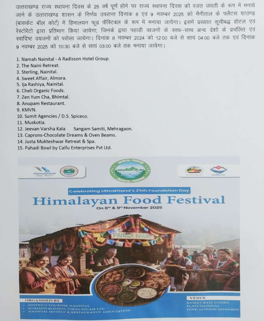 नैनीताल:-उत्तराखण्ड राज्य स्थापना दिवस के 25 वर्ष पूर्ण होने पर राज्य स्थापना दिवस को रजत जयती के रूप में मनाये जाने के उत्तराखण्ड शासन के निर्णय उपरान्त दिनांक 8 एवं 9 नवम्बर 2025 को नैनीताल के फ्लैटस ग्राउण्ड (बासकेट बॉल कोर्ट) में हिमालयन फूड फेस्टिबल के रूप में मनाया जायेगा। इसमें प्रख्यात सूचीबद्ध होटल एवं रेस्टोरेंटो द्वारा प्रतिभाग किया जायेगा, जिनके द्वारा पहाडी व्यजनों के साथ-साथ अन्य देशों के प्रचलित एवं स्वादिष्ट वयजनों को परोसा जायेगा। दिनांक 8 नवम्बर 2024 को 12:00 बजे से सायं 04:00 बजे तक एवं दिनांक 9 नवम्बर 2025 को 10:30 बजे से सायं 03:00 बजे तक मनाया जायेगा।
