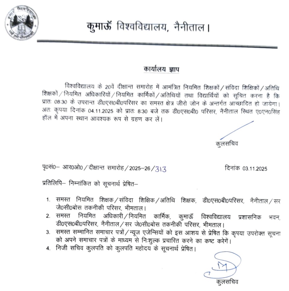नैनीताल:- कुमाऊँ विश्वविद्यालय का 20वाँ दीक्षांत समारोह दिनांक 4 नवम्बर 2025 (मंगलवार) को विश्वविद्यालय के ए. एन. सिंह सभागार, डी.एस.बी. परिसर, नैनीताल में आयोजित किया जा रहा है। इस अवसर पर सभी आमंत्रित अतिथियों, पदक प्राप्तकर्ताओं, संकाय सदस्यों एवं विद्यार्थियों से अनुरोध है कि वे प्रातः 9:00 बजे तक अपने निर्धारित स्थानों पर विराजमान हो जाएँ।