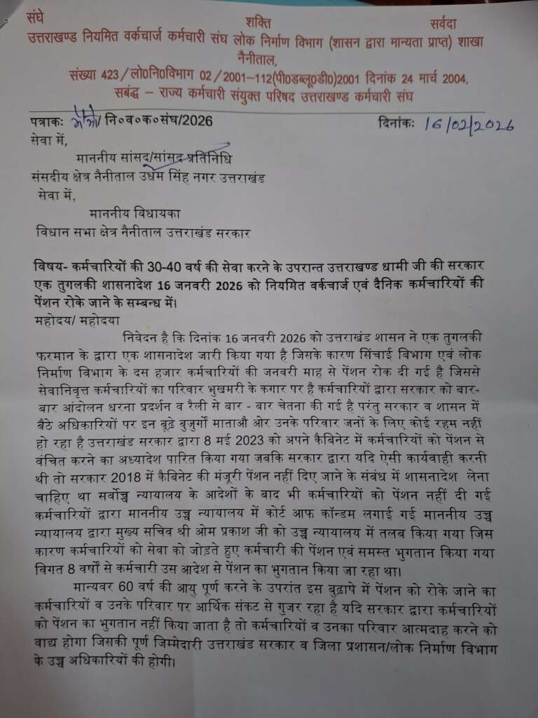 को पेंशन का भुगतान नहीं किया जाता है तो कर्मचारियों व उनका परिवार आत्मदाह करने को वाद्य होगा जिसकी पूर्ण जिम्मेदारी उत्तराखंड सरकार व जिला प्रशासन/लोक निर्माण विभाग के उच्च अधिकारियों की होगी।