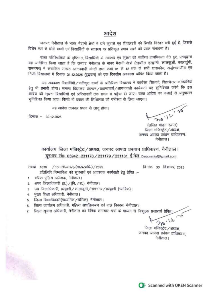 जिला मजिस्ट्रेट एवं अध्यक्ष, जनपद आपदा प्रबंधन प्राधिकरण, नैनीताल द्वारा जारी आदेश के अनुसार तहसील हल्द्वानी, लालकुआँ, कालाढूंगी एवं रामनगर क्षेत्र में संचालित समस्त आंगनबाड़ी केंद्रों तथा कक्षा 01 से 12 तक के सभी शासकीय, अशासकीय एवं निजी विद्यालयों में दिनांक 31 दिसंबर 2025 (बुधवार) को अवकाश रहेगा।