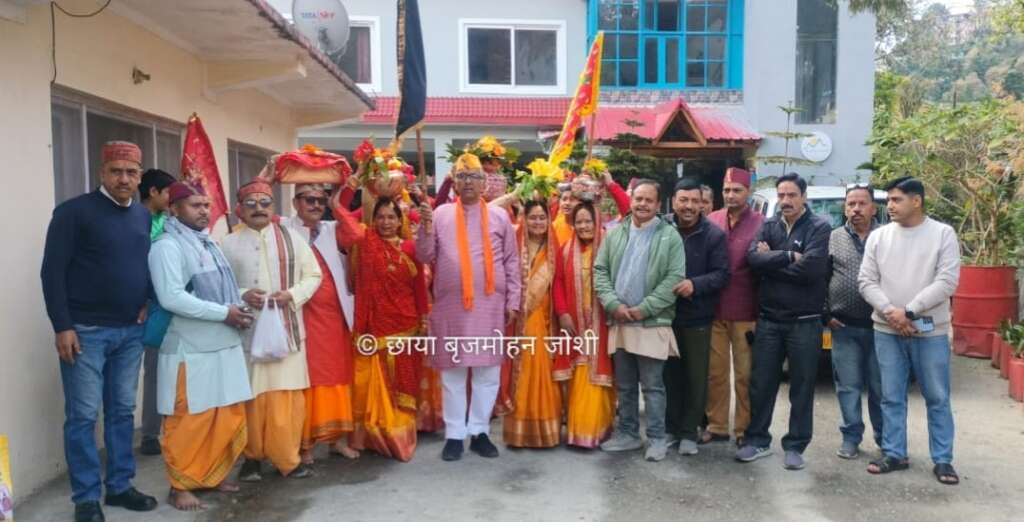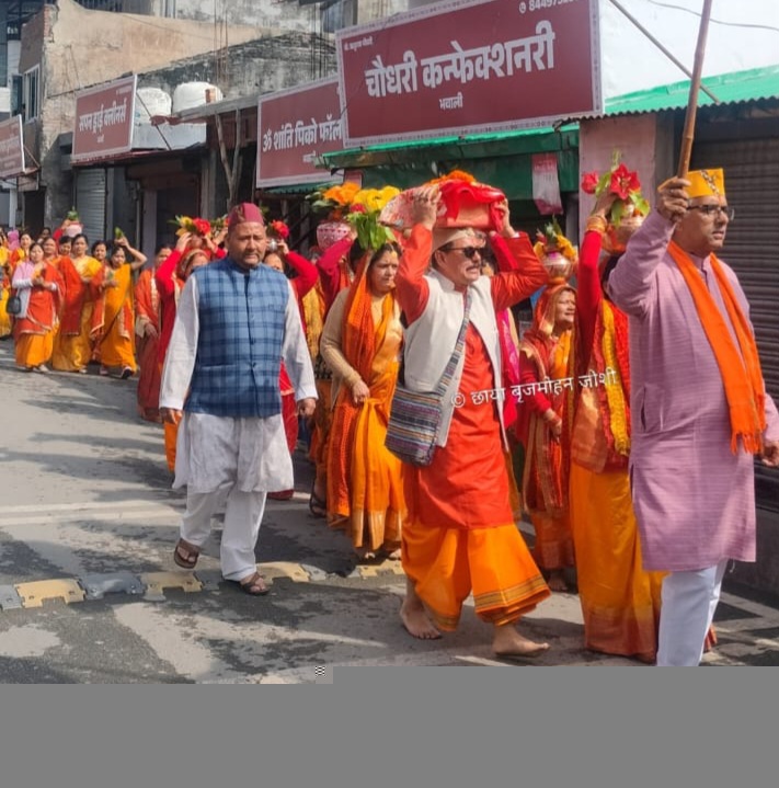 भवाली/नैनीताल:- नगर के देवी मंदिर में१९ मार्च से २८ मार्च २०२६ तक आयोजित श्रीमद् देवी भागवत कथा ज्ञान यज्ञ के प्रथम दिवस गुरुवार को प्रातः आचार्य गिरीश चंद्र जोशी,कैलाश चंद्र पांडे, कैलाश जोशी, मोहन चन्द कपिल,नीरज पडलिया ,दीपेश कपिल द्वारा देवी भागवत कथा के मुख्य आयोजक यजमान श्रीमती एवं श्री बालम सिंह मेहरा जी पुत्र श्रीमती एवं श्री सगत सिंह मेहरा,जी की उपस्थिति में सभी आचार्य द्वारा देवी भगवती विग्रह का निर्माण नवग्रह निर्माण, सर्वत्तो भद्र निर्माण,गणेश पूजन,पंचांग पूर्वांगादि -पूजन किया गया। इसके उपरांत मातृशक्ति द्वारा शहर में कलश यात्रा निकाली गई जो भवाली बाजार से होते हुए देवी मंदिर पहुंची जहां मातृशक्ति द्वारा सुन्दर देवी भजनों का गायन किया गया।