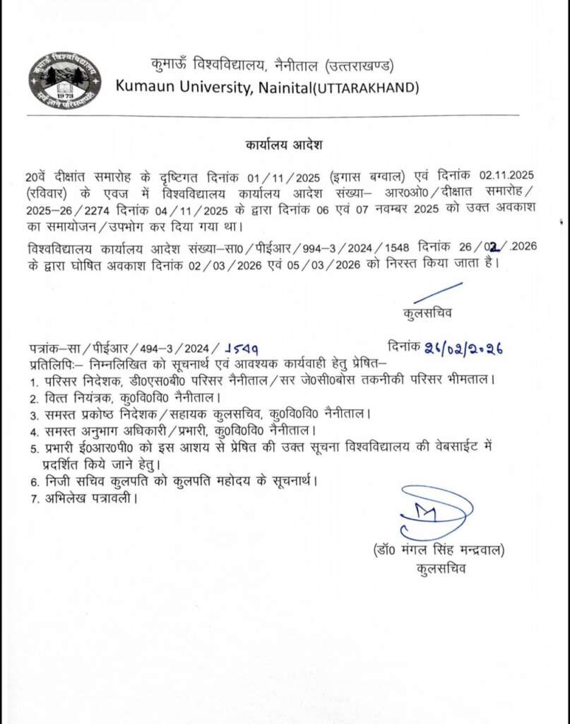 नैनीताल:- कुमाऊँ विश्वविद्यालय, नैनीताल द्वारा 02 मार्च 2026 एवं 05 मार्च 2026 को घोषित अवकाश निरस्त कर दिए गए हैं।