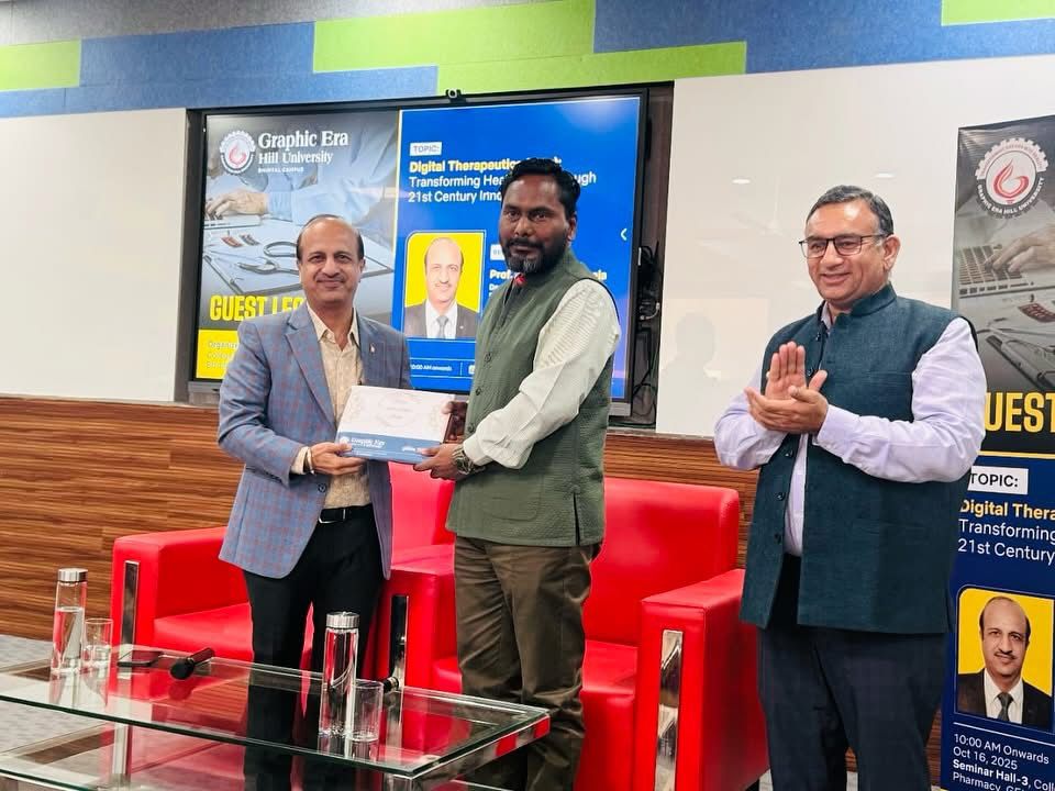 भीमताल/नैनीताल:-ग्राफिक एरा हिल विश्वविद्यालय, भीमताल के फार्मेसी कॉलेज में “डिजिटल थेरेप्यूटिक्स: 21वीं सदी के नवाचारों के माध्यम से स्वास्थ्य सेवा में परिवर्तन” विषय पर एक व्याख्यान आयोजित किया गया। कार्यक्रम की शुरुआत प्राचार्य एवं संकाय सदस्यों द्वारा अतिथि का स्वागत एवं सम्मान के साथ हुई। इस अवसर पर मुख्य वक्ता के रूप में प्रो. (डॉ.) हरीश दुरेजा उपस्थित रहे।