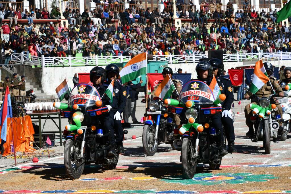 पुलिस परेड के कमांडर श्री रविकांत सेमवाल क्षेत्राधिकारी नैनीताल परेड के नेतृत्व में कुल 07 टोलियां सम्मिलित क्रमश: (यातायात पुलिस, सशस्त्र पुलिस, नागरिक पुलिस, आईआरबी 1, नागरिक पुलिस महिला, 31 वीं वाहिनी पीएसी, अग्निशमन के अतिरिक्त जनपद के थाना क्षेत्र स्तर पर संचालित चीता मोबाइल पुलिस, सी.पी.यू., फायर सर्विस यूनिट, बम डिस्पोजल यूनिट, डॉग स्क्वाड, इंटरसेप्टर वाहन, सिटी/हाइवे पेट्रोल वाहन, फॉरेंसिक वाहन, दंगा नियंत्रण वाहन, एंटी ह्यूमन ट्रैफिकिंग यूनिट, पुलिस संचार वाहनों द्वारा बड़े उत्साह व जोश के साथ मंच से गुजरते हुए राष्ट्रीय ध्वज, मुख्य अतिथि एवम मंच में आसीन समस्त महानुभावों का अभिवादन किया गया।