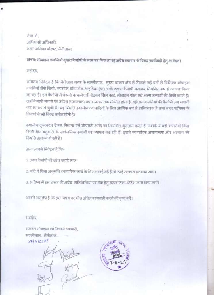 नैनीताल:- नगर के स्थानीय मोबाइल एवं रिचार्ज व्यापारियों द्वारा अधिशासी अधिकारी नगर पालिका परिषद नैनीताल को ज्ञापन सौंपा गया, जिसमें मोबाइल कंपनियों द्वारा बिना किसी अनुमति के केनॉपियों के नाम पर किए जा रहे व्यापार पर तत्काल रोक लगाने की मांग की गई है।शहर के मल्लीताल मुख्य बाज़ार में इन दिनों एक अजीब स्थिति देखने को मिल रही है -जहाँ एक ओर छोटे दुकानदार शासन-प्रशासन के नियमों और टैक्स के बोझ तले दबे हुए हैं, वहीं दूसरी ओर देश की बड़ी मल्टीनेशनल मोबाइल कंपनियाँ खुलेआम फड़ लगाकर कारोबार कर रही हैं।