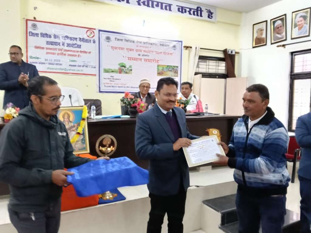 नैनीताल:- माननीय उत्तराखण्ड राज्य विधिक सेवा प्राधिकरण, नैनीताल के दिशा निर्देशानुसार एवं अध्यक्ष जिला विधिक सेवा प्राधिकरण, नैनीताल / जिला न्यायाधीश श्री हरीश कुमार गोयल जी के निर्देशन में सिविल जज (सी०डि०) / सचिव, जिला विधिक सेवा प्राधिकरण, नैनीताल श्रीमती पारुल थपलियाल द्वारा रामगढ़ ब्लॉक सभागार में ग्राम सम्मान समारोह का आयोजन किया गया जिसमें मुख्य अतिथि के रूप में अपर जिला जज श्री संजीव कुमार जी उपस्थित रहे। शिविर का शुभारंभ मुख्य अतिथि द्वारा दीप प्रज्ज्वलित कर राजकीय बालिका इंटर कालेज रामगढ़ की छात्राओं द्वारा सरस्वती वंदना के साथ के साथ की गई। शिविर को आगे बढ़ते हुए सचिव जिला विधिक सेवा प्राधिकरण द्वारा जिला विधिक सेवा प्राधिकरण के कार्यकलापों के बारे में जानकारी दी गई, साथ ही श्री सोहन तिवारी चीफ लीगल एड डिफेंस कौंसिल नैनीताल द्वारा भी जिला विधिक के कार्यों,लीगल एड,फ्रंट ऑफिस के बारे में जानकारी दी गई। एस एच ओ भवाली द्वारा मोटर वाहन अधिनियम की जानकारी साझा की है, तत्पश्चात् अपर मुख्य न्यायिक मजिस्ट्रेट महोदय रवि रंजन द्वारा पोस्को एक्ट के बारे में विधिक जानकारी उपलब्ध कराई।शिविर में मुख्य अतिथि द्वारा (NDPS act) के प्रावधानों के बारे में आम जनमानस को जागरूक किया।रामगढ़ ब्लॉक से “मुकदमा मुक्त ग्राम सम्मान पहल योजना” के तहत चयनित 7 ग्रामों को प्रमाण पत्र देकर सम्मानित किया गया।शिविर के अंत में सिविल जज सीनियर डिविजन श्री हर्ष यादव द्वारा सभी का धन्यवाद ज्ञापन कर कार्यक्रम का समापन की घोषणा की गई।उक्त शिविर में खंड विकास अधिकारी का मुख्य सहयोग रहा, जिसमें ब्लॉक प्रमुख,आशा कार्यकर्ता,आंगनबाड़ी कार्यकर्ता, ब्लॉक रामगढ़ के सभी कर्मचारिगण, छात्र- छात्राएं,आम जनमानस उपस्थित रहे।