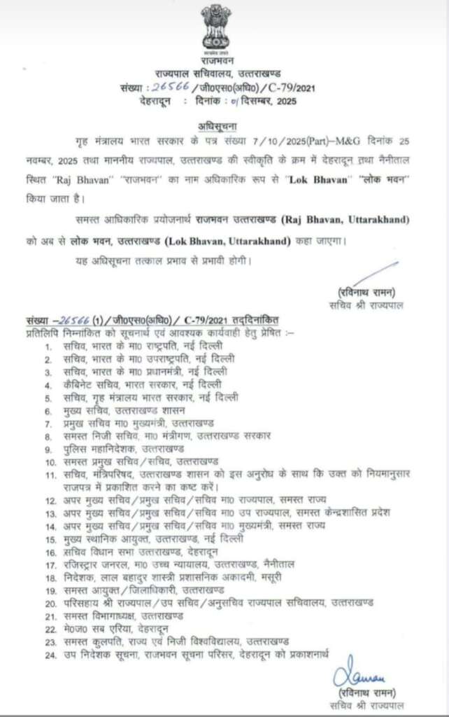 जारी अधिसूचना के अनुसार, अब सभी सरकारी कार्यों में Raj Bhavan, Uttarakhand की जगह Lok Bhavan, Uttarakhand नाम का उपयोग किया जाएगा। यह आदेश तत्काल प्रभाव से लागू हो गया है।