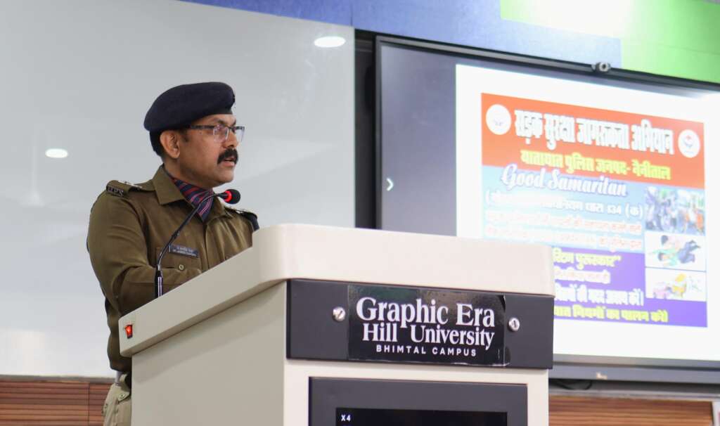 भीमताल नैनीताल:- ग्राफिक एरा हिल यूनिवर्सिटी, भीमताल परिसर में सड़क सुरक्षा जागरूकता सप्ताह के अवसर पर एक विशेष कार्यक्रम का आयोजन किया गया। कार्यक्रम का उद्देश्य विद्यार्थियों को सड़क सुरक्षा के प्रति जागरूक करना और सड़क दुर्घटनाओं में कमी लाने के उपायों पर प्रकाश डालना था।