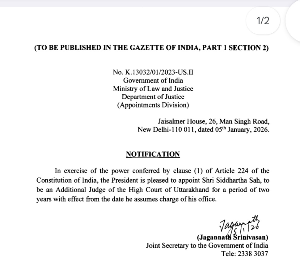 नैनीताल:- भारत सरकार के कानून एवं न्याय मंत्रालय द्वारा नैनीताल नगर निवासी अधिवक्ता सिद्धार्थ साह को उत्तराखंड उच्च न्यायालय का अतिरिक्त न्यायधीश नियुक्त किया गया है। भारत सरकार के संयुक्त सचिव जगन्नाथ श्रीनिवास द्वारा हस्ताक्षरित यह आदेश सोमवार को नई दिल्ली के जैसलमेर हाउस से जारी किया गया।