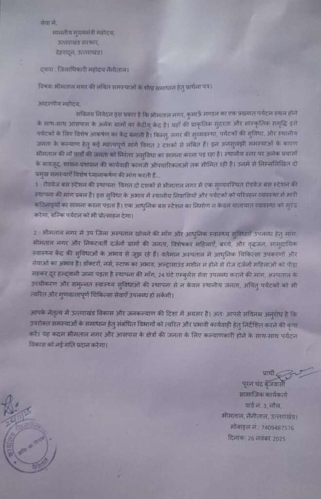 ज्ञापन में मुख्यमंत्री से अनुरोध किया गया कि संबंधित विभागों को शीघ्र निर्देश जारी कर भीमताल की इन प्रमुख समस्याओं का समाधान कराया जाए, जिससे स्थानीय जनता व पर्यटकों दोनों को राहत मिल सके।