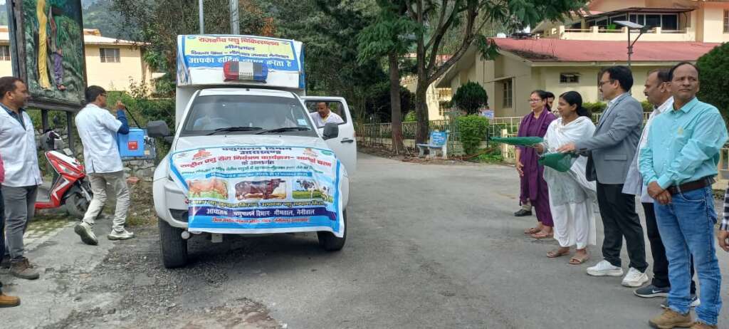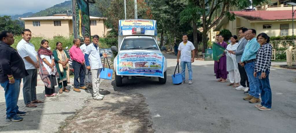 भीमताल/नैनीताल:-राष्ट्रीय पशु रोग नियंत्रण कार्यक्रम के अंतर्गत रविवार को विकास भवन भीमताल से मुख्य विकास अधिकारी अनामिका द्वारा एफएमडी कार्यक्रम(पशुओं में संक्रमण की रोकथाम हेतु टीकाकरण कार्यक्रम) के सातवें चरण का शुभारंभ किया गया। इस अवसर पर मुख्य विकास अधिकारी द्वारा निर्देश दिए गए की निर्धारित अवधि के अंतर्गत शत प्रतिशत लक्ष्यों की पूर्ति की जाए, ताकि 2030 तक भारत को एफएमडी फ्री किया जा सके। इस अवसर पर डॉ डी सी जोशी मुख्य पशु चिकित्सा अधिकारी नैनीताल द्वारा अवगत कराया गया कि जनपद में सभी विकास खंड में वैक्सीनेशन की टीमें गठित कर दी गई है। ताकि निर्धारित अवधि के अंतर्गत टीकाकरण के लक्ष्यों को पूर्ण किया जा सके। इस अवसर पर डॉ आर ए दीक्षित वरिष्ठ पशु चिकित्सा अधिकारी भीमताल, डॉ गरिमा बिष्ट, तथा पशुधन प्रसार अधिकारी एवं विभागीय कर्मचारी उपस्थित थे।