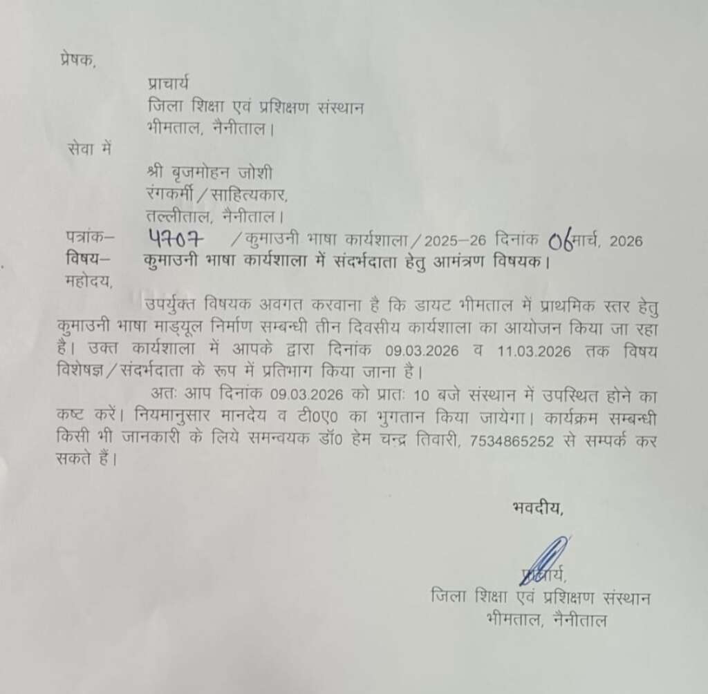 भीमताल/ नैनीताल:- जिला शिक्षा एवं प्रशिक्षण संस्थान डायट भीमताल नैनीताल द्वारा दिनांक ०९ मार्च से ११ मार्च २०२६ तक आयोजित विषय- प्राथमिक स्तर हेतु कुमाऊंनी भाषा माड्यूल निर्माण सम्बन्धी कार्यशाला हेतु विशेषज्ञ/ सन्दर्भ दाता के लिए रंगकर्मी व साहित्यकार बृजमोहन जोशी को आमंत्रण पत्र प्राप्त हुआ है।