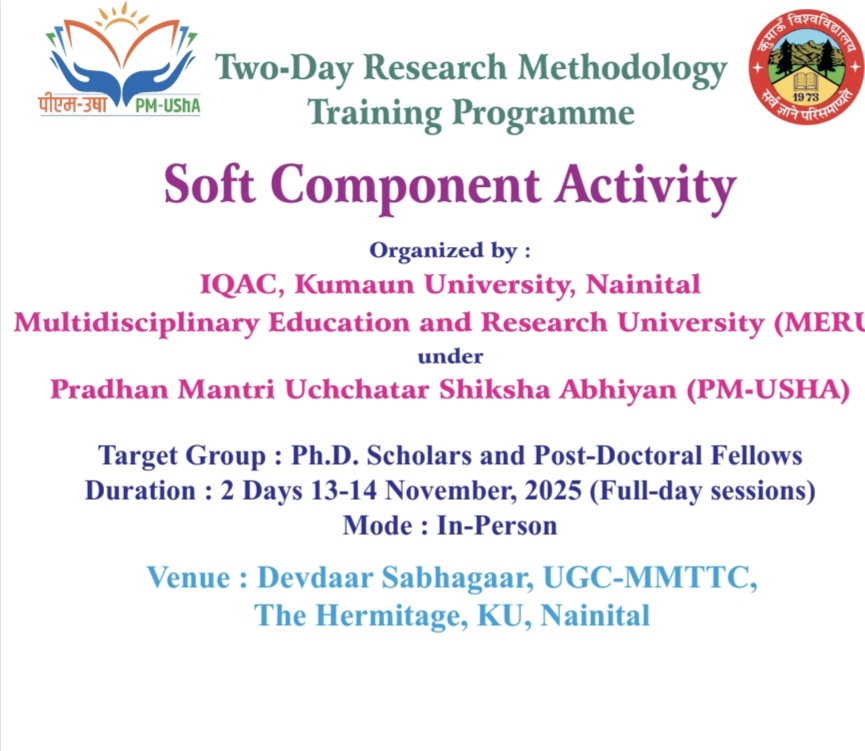 नैनीताल:- कुमाऊँ विश्वविद्यालय, नैनीताल के आंतरिक गुणवत्ता आश्वासन प्रकोष्ठ (आइक्यूएसी एम) द्वारा प्रधानमंत्री उच्चतर शिक्षा अभियान (पीएम –उषा) के अंतर्गत बहुविषयक शिक्षा एवं अनुसंधान विश्वविद्यालय (मेरु) पहल के तहत दो दिवसीय “शोध कार्यप्रणाली प्रशिक्षण कार्यक्रम” का आयोजन 13 और 14 नवम्बर 2025 को देवदार सभागार, यूजीसी–एमएमटीटीसी, द हर्मिटेज, नैनीताल में किया जा रहा है। इस प्रशिक्षण कार्यक्रम का उद्देश्य शोधार्थियों को आधुनिक शोध पद्धतियों, नैतिक मानकों तथा अकादमिक लेखन की नवीन तकनीकों से अवगत कराना है।